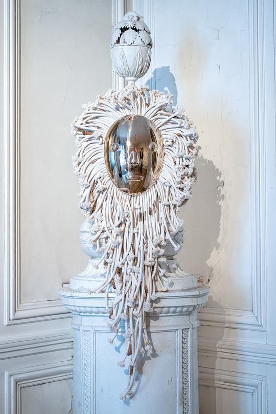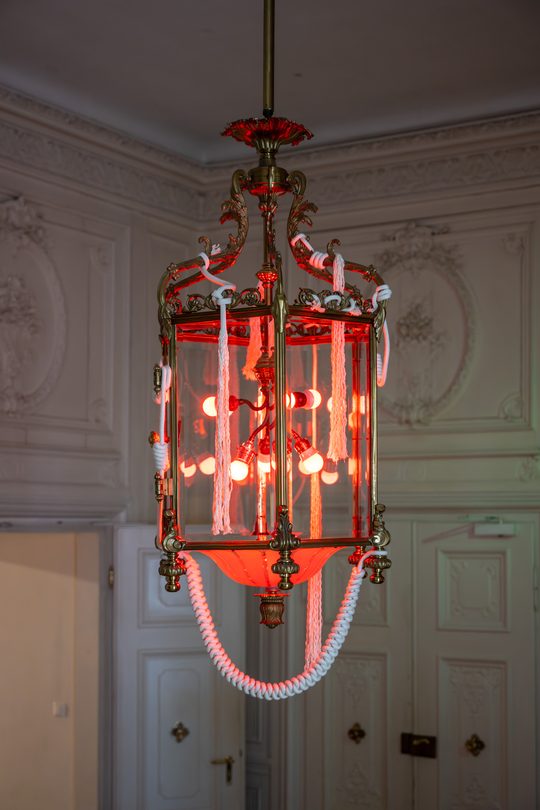 Az immateriális és mindenütt jelenlévő fényt általában csak akkor vesszük észre, ha a környező felületekről visszaverődik. A művésztrió az előcsarnok központi csillárján végzett beavatkozásával az észlelést és a tapasztalást alakító immateriális erőkre irányítja a figyelmet.
