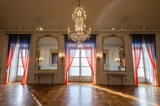 A Tükörterem ablakaiból egy mindig ugyanolyannak tűnő, de valójában állandóan változó kép tárul elénk. Ezt a rétegzett időbeliséget kívánják érzékeltetni és kiemelni az EJTECH függönyei. Ahogy a fény vándorol a drapérián úgy tárja fel annak különböző részleteit és egyben visszatükrözi a környező építészetben rejtőző történetek finom lenyomatait.