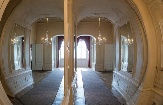 A kastély szívében fekvő központi terem volt a társasági események, a társasjátékok, az izgalmas beszélgetések és a csillogó estélyek helyszíne. A tér korábbi elnevezését, a Nagy játékszobát, egy a 18. században a terem közepén álló billiárd asztalnak köszönheti. Amikor 1897-ben a barokk homlokzatra még egy klasszicista balkont építettek, akkor egyszerűen átkeresztelték Balkon-szobának. De a terembe lépve mára egy teljesen más történet tárul elénk. A fehér fapaneleken felfedezhető különböző hangszerek egykori koncerteket idéznek, a festmények pompás kereteit arany masnik koronázzák, a három óriási ablak és két tükör, valamint az elegáns asztalok igazi méltóságot kölcsönöznek a teremnek. Nem csoda, hogy hamarosan új elnevezés honosodott meg: a Tükörterem.