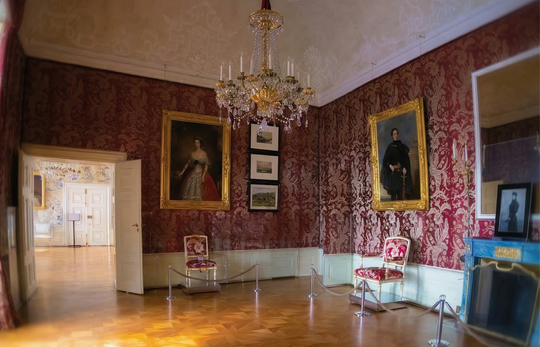 A Vörös szalonban a letűnt császári kor szelleme érinti meg a látogatót. Egykor az Esterházy-hercegnék intim menedékhelye volt: világosság, a sárga szín sárga drapériák és játékasztalok határozták meg a hálószoba melletti fogadószoba hangulatát. A vörös elnevezés csak az 1850-es évektől jellemző, amikor is feltehetően a híres lyoni műhelyekből származó ezüst akantuszleveles vörös selyemtapétával vonták be falait. Ami valaha pompával ragyogott, az ma inkább megborzongat. A historizáló festményekről visszaköszönő sötét tekintetek, a gyászruhában lefotózott Sisi császárné, az idő lelket nyomó súlya együttesen szővik a különös, dermedt bőr alá kúszó aurát. Talán pont a letűnt múlt melankóliája teszi igazán különlegesség a Vörös Szalont. Halk suttogás sejlik, mintha az egykori lakók ki-be járó szellemei a nyitott tapétaajtókon keresztül lebegnének a térben.