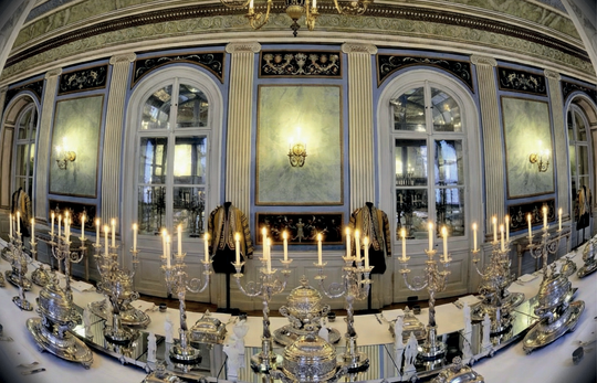 Az Esterházy-hercegek majorátusi ezüstjével megterített asztal az egykori ebédlőben az 1800-as évekből – a korszak legnagyobb, fennmaradt ezüst étkészlete.